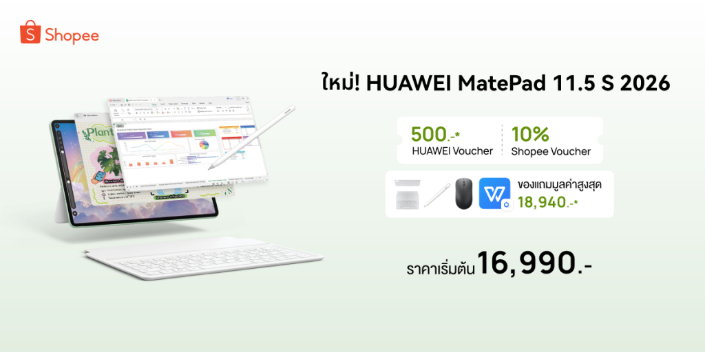 หัวเว่ยร่วมกับ Shopee จัดโปรฯ 2 ต่อ! เป็นเจ้าของแท็บเล็ต HUAWEI MatePad 11.5 S 2026 ในราคาเพียง 16,990 บาท ฟรี! ของแถมมูลค่าสูงสุด 19,339 บาท