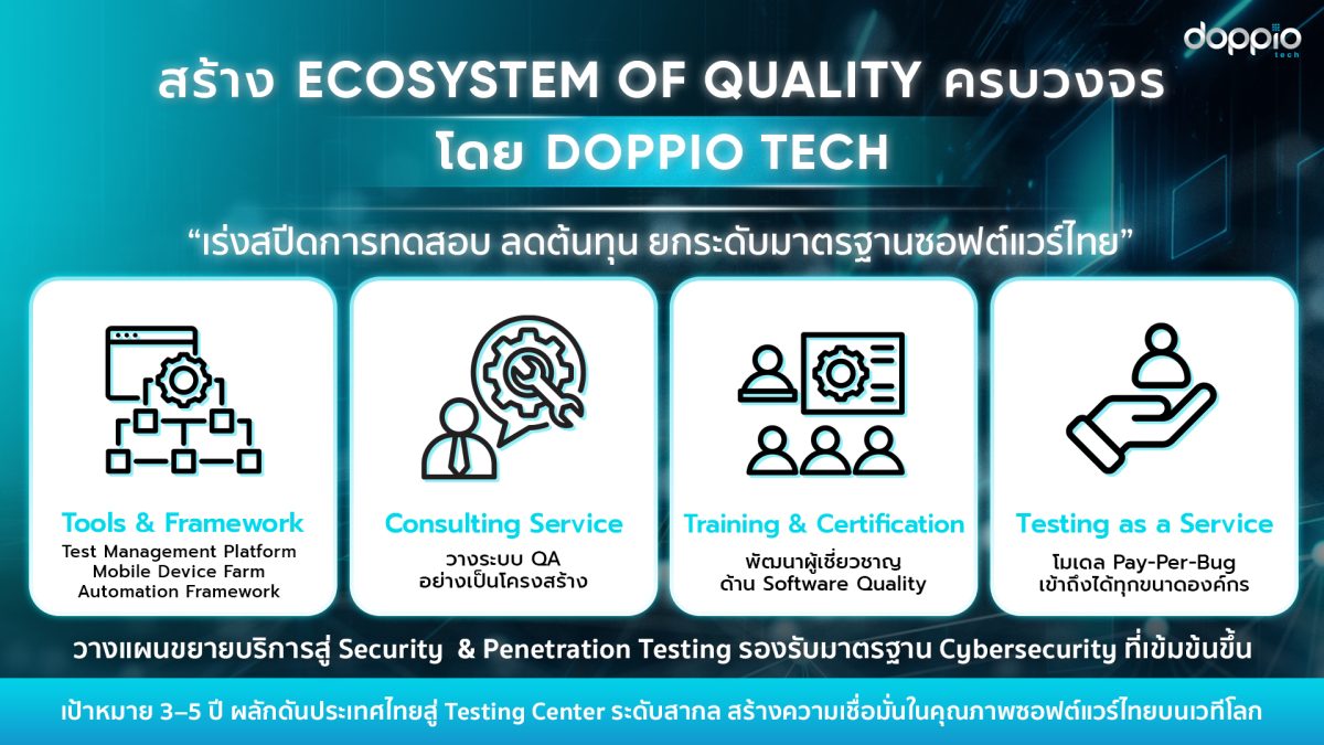 • สร้าง Ecosystem ด้าน Software Quality แบบครบวงจร: Doppio Tech มีแผนพัฒนา Ecosystem ครอบคลุมตั้งแต่ต้นน้ำถึงปลายน้ำ ได้แก่
