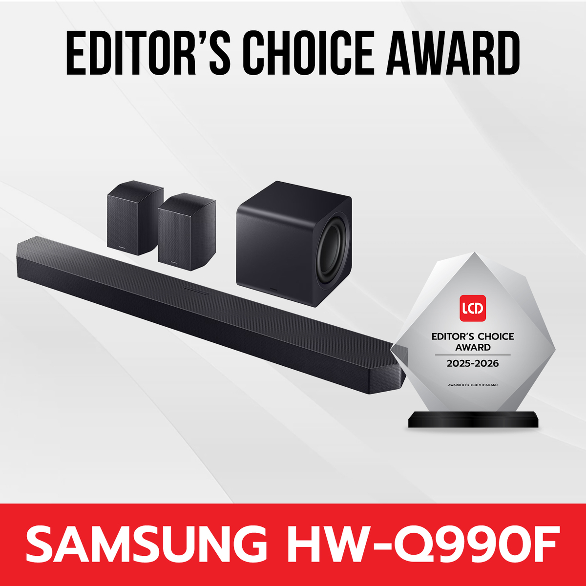 นอกจากนี้ ซัมซุงยังคว้ารางวัล Best Of The Best Soundbar Award 2025 – 2026 ประเภท Editor’s Choice Award ในกลุ่มผลิตภัณฑ์ซาวด์บาร์ จากรุ่น Samsung HW-Q990F โดยมีจุดเด่นที่ประสบการณ์เสียงรอบทิศทางด้วยระบบเสียง 11.1.4 แชนแนล พร้อมเสริมความสมจริงยิ่งขึ้นด้วย Dolby Atmos และ DTS:X มาพร้อมชุดลำโพงครบทั้งบาร์หลัก ลำโพงเซอร์ราวด์ และซับวูฟเฟอร์ไร้สายในกล่องเดียว พร้อมรองรับการสตรีมผ่าน AirPlay, Google Cast, Tidal และ Spotify รวมทั้งยังทำงานร่วมกับทีวีซัมซุงได้อย่างลงตัวผ่านฟีเจอร์ Wireless Dolby Atmos และ Q-Symphony ช่วยผสานเสียงจากซาวด์บาร์และลำโพงทีวีให้มิติของเสียงสมจริงยิ่งขึ้น ตอบโจทย์ประสบการณ์โฮมเอ็นเตอร์เทนเมนต์ระดับพรีเมียม