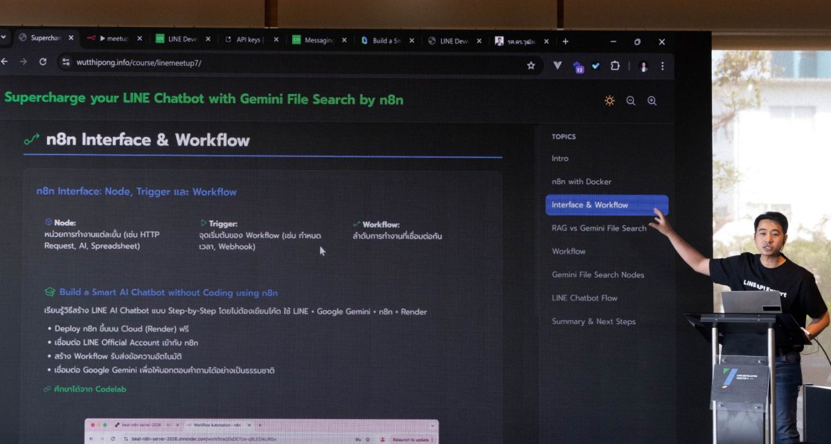 นอกจากนี้ ภายในงานยังอัดแน่นด้วยองค์ความรู้จาก Use Case จริงและเทคโนโลยีที่สามารถนำไปใช้งานได้ทันที ครอบคลุมตั้งแต่การออกแบบประสบการณ์ลูกค้าแบบ End-to-End บน LINE ผ่านกรณีศึกษาของธุรกิจร้านอาหารบาร์บีคิวพลาซ่า ที่เชื่อมต่อ LINE OA, LIFF และ LINE Messaging API เข้ากับระบบหน้าร้านอย่างครบวงจร ไปจนถึงการยกระดับ LINE Chatbot ด้วย AI ผ่านแนวคิด “Zero-Code RAG” ที่ช่วยให้นักพัฒนาสร้างระบบตอบคำถามจากเอกสารได้ภายในไม่กี่นาทีโดยไม่ต้องพัฒนาโครงสร้างซับซ้อนเอง พร้อมต่อยอดสู่การสร้างประสบการณ์ใหม่ผ่าน LINE MINI App อย่างแพลตฟอร์มการ์ดอวยพรดิจิทัลที่ออกแบบ UX ให้ใช้งานได้อย่างลื่นไหล รวมถึงการถ่ายทอด Framework สำคัญในการเลือกใช้เทคโนโลยีระหว่าง LINE Chatbot และ LINE MINI App ให้เหมาะสมกับแต่ละธุรกิจ ผ่านการสาธิตการใช้งานจริงและ Best Practices ที่สามารถนำไปปรับใช้ได้ทันทีในงานพัฒนา
