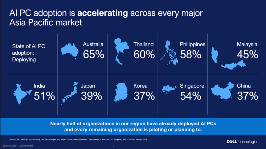 รายงานจากไอดีซี ซึ่งจัดทำขึ้นโดยเดลล์ เทคโนโลยีส์ และอินเทล ตอกย้ำแรงขับเคลื่อนดังกล่าว เมื่อ AI เข้ามามีบทบาทในงานประจำวันมากขึ้น กลยุทธ์ด้านอุปกรณ์จึงปรับตามไปด้วย โดยปัจจุบัน 89% ขององค์กรในภูมิภาคเอเชียแปซิฟิก พิจารณาความสามารถด้าน AI เป็นปัจจัยสำคัญในการตัดสินใจซื้อพีซีในอนาคต ซึ่งความสำคัญดังกล่าวเห็นได้ชัดในตลาดหลักทั่วทั้งภูมิภาคตั้งแต่ออสเตรเลีย และเกาหลีใต้ ซึ่งองค์กรให้ความสำคัญกับ AI ในการตัดสินใจซื้อสูงกว่าค่าเฉลี่ยของภูมิภาค ไปจนถึงอินเดียที่ประสิทธิภาพด้าน AI ขั้นสูงกำลังถูกหยิบยกเป็นเกณฑ์หลักในการประเมิน ขณะที่ในจีน ความเร่งด่วนดังกล่าวยิ่งชัดเจนขึ้น เมื่อองค์กรเริ่มตระหนักว่าความล่าช้าในการนำ AI PC มาใช้ อาจสร้างความเสี่ยงเรื่องการมีส่วนร่วมของพนักงานและคุณภาพการตัดสินใจ