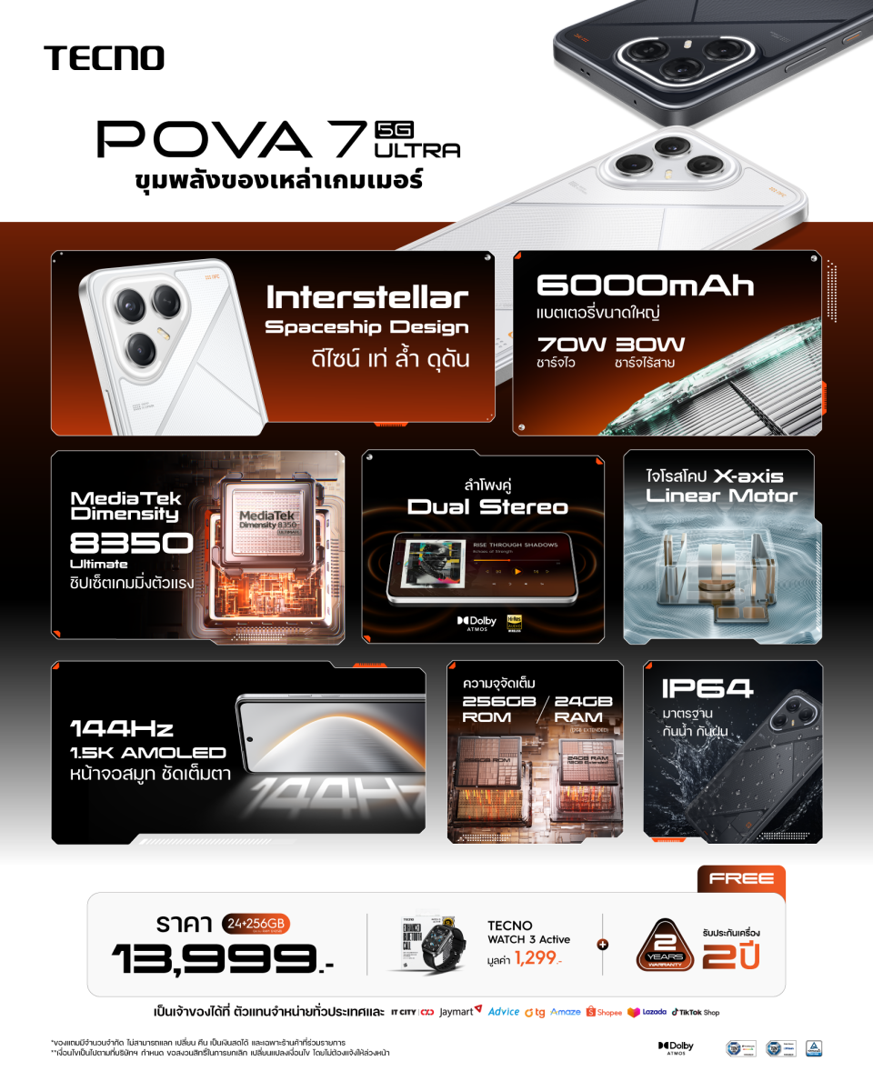 พร้อมให้คุณเป็นเจ้าของแล้ววันนี้ โดย TECNO POVA 7 Ultra 5G มาพร้อมหน่วยความจำขนาดใหญ่จุใจ 24GB (RAM) + 256GB (ROM) ในราคาสุดคุ้มค่าเพียง 13,999 บาท พิเศษสุด! สำหรับช่วงเปิดตัว * รับฟรีทันที! สมาร์ทวอทช์ TECNO Active Watch 3 มูลค่า 1,299 บาท และ อุ่นใจยิ่งขึ้นด้วย การรับประกันตัวเครื่องยาวนานถึง 2 ปี ตั้งแต่วันนี้เป็นต้นไปหรือจนกว่าของแถมจะหมด โดยสามารถเลือกซื้อได้ที่ ร้านค้าทางการของ TECNO บนแพลตฟอร์ม Online TikTok, Shopee, Lazada และ Amaze และหน้าร้านตัวแทนจำหน่าย สัมผัสเครื่องจริงและเป็นเจ้าของได้ที่ร้านไอทีชั้นนำทั่วประเทศ ได้แก่ IT City CSC Jaymart Advice และ TG และพร้อมเปิดให้เป็นเจ้าของได้ง่ายยิ่งกว่าที่เคยกับ UFUND ผ่อนง่ายไม่ง้อบัตรเครดิต เริ่มต้นเพียง 0 บาท (*เงื่อนไขเป็นไปตามที่บริษัทกำหนด)และสามารถสัมผัสประสบ การณ์การใช้งานจริงของ MEGA Mini G1 และจอ MEGA View GT ได้ที่ TECNO Experience Zone ณ โรบินสันสุพรรณบุรี ได้แล้ววันนี้